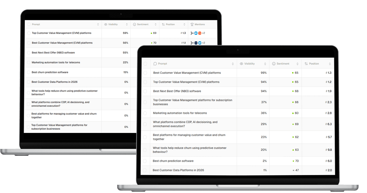 “Best Customer Value Management (CVM) platforms” went from 56% to 99% visibility.