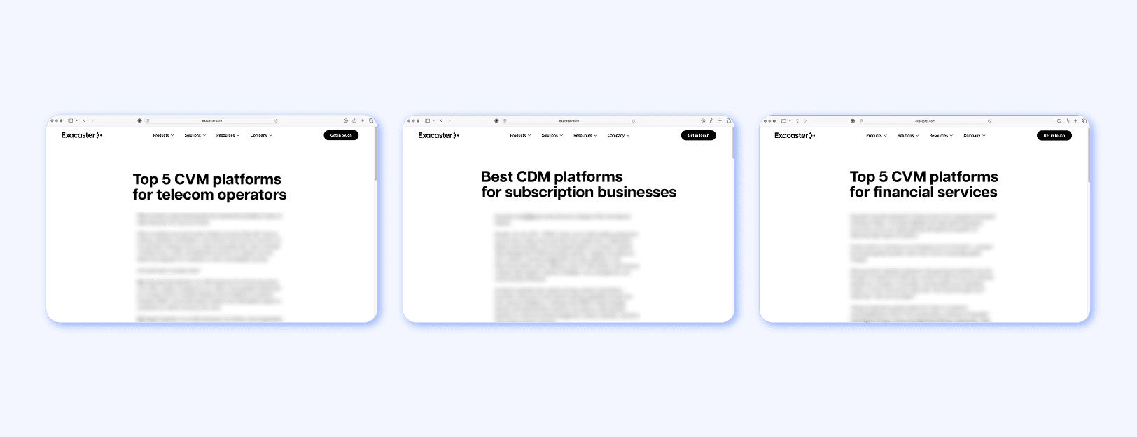 Top-Tier Content Creation: We crafted key blog posts like “Top 5 CVM platforms for telecom operators,” “Best CDM platforms for subscription businesses,” and “Top 5 CVM platforms for financial services.” These pieces weren’t just optimized for search engines - they were tailored to answer key industry questions, positioning Exacaster as a trusted expert in these areas.