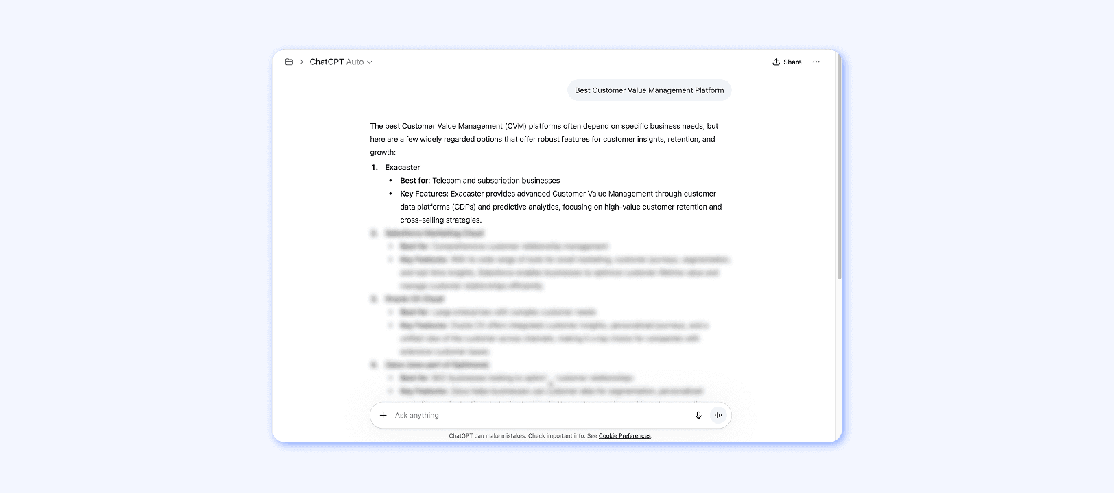Top Ranking: Exacaster became the number one result when prompted with “Best Customer Value Management Platform” in both Google AI Mode and ChatGPT.